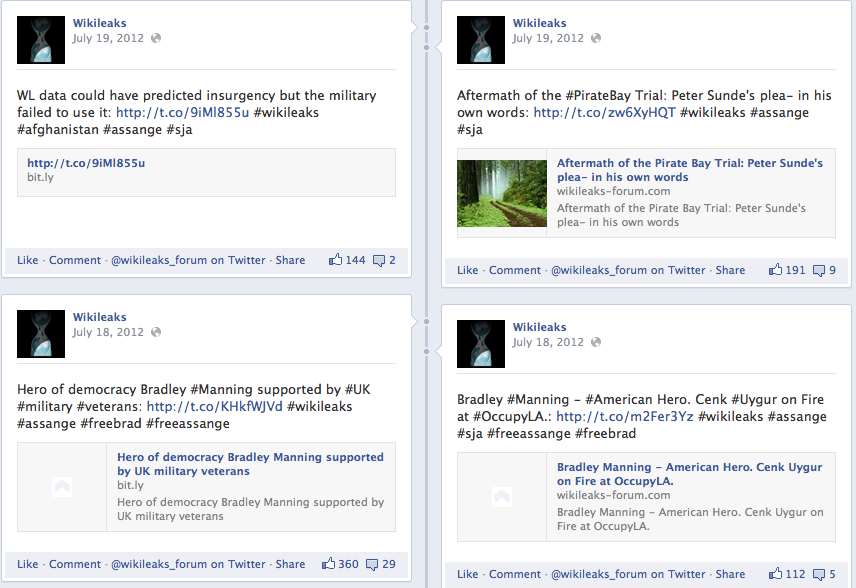 On the 19th of July while I was tweeting from the forum’s account and having several tabs open, I noticed that every time I tweeted the WikiLeaks FB page was getting updates, upon checking I nearly fell off my chair. My WLForum tweets full of hashtags were appearing as posts in the WikiLeaks Facebook Page which at the time had more than 1.5 million ‘Likes’. I simply panicked. At that point I did not even know that it was possible to link Twitter and Facebook, one feeding the other. Apart from the embarrassment of filling 1.5 million FB Feeds with ugly hashtags the question remained that neither Mark, nor myself had any authority to post there, so why was this happening?