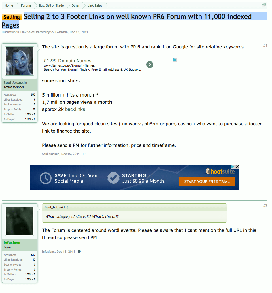Mark Advertises Footer links at the http://www.wikileaks-forum.com for Sale in December 2011, using the aliases Soul Assassin & Infusionx