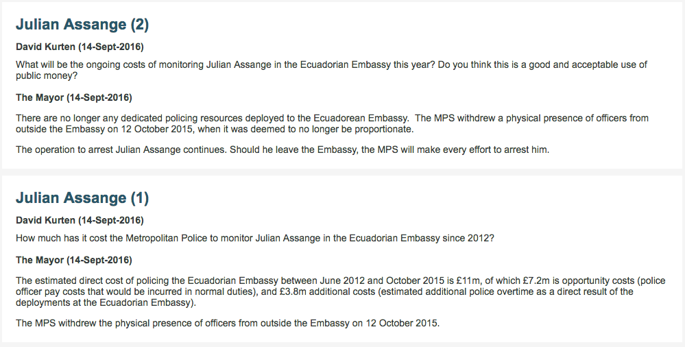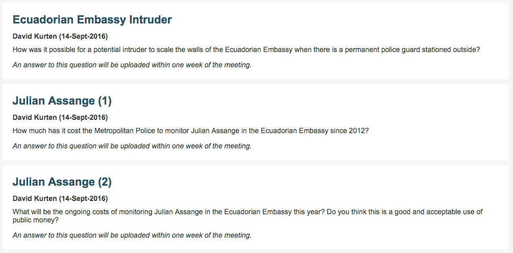 In response to my letter to London Assembly Members about “What is the Metropolitan police doing in the #Assange and #WikiLeaks Embassy Surveillance?” member David Kurten has tabled three questions for the Mayor today: