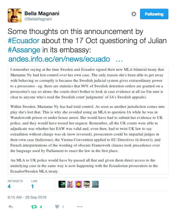 Julian Assange will wait no more. On the 17th of October 2016 he will be finally questioned, the first progress in the preliminary investigation in 6 years. What can be the outcome no one can say but there is something that has changed in the process of investigation and no one says it better than WLsup @BellaMagnani with a twitter post: