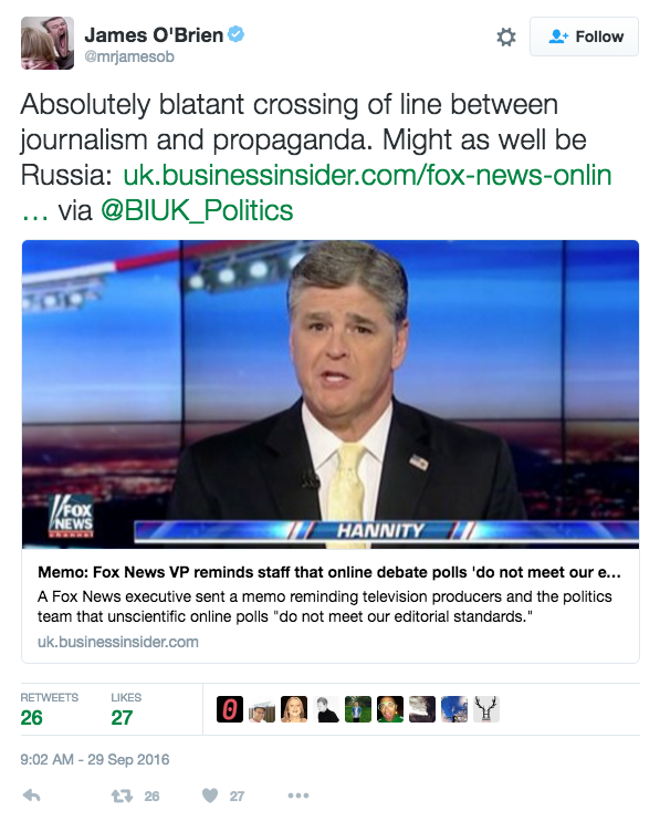 A Tweet by James O’Brien prompted me to compare his work in interviewing Roland Adjovi for BBC ‘Newsnight’ to others who did the same. I invite you to compare and contrast the interviews and ask yourself, who informs through journalism and who propagandises. With reference to his tweet (see below) perhaps Mr O’Brien is more Russian than the Russians if we judge his propagandist performance at the BBC to the Ruptly (RT) interview below. Or perhaps he is simply…from Mars! 🙂