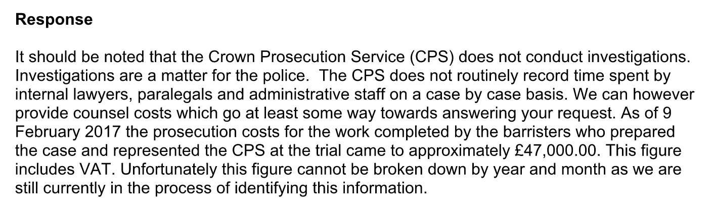 This is obviously a very partial disclosure of the costs involved, only focusing on the outside hiring fees for barristers representing the CPS.