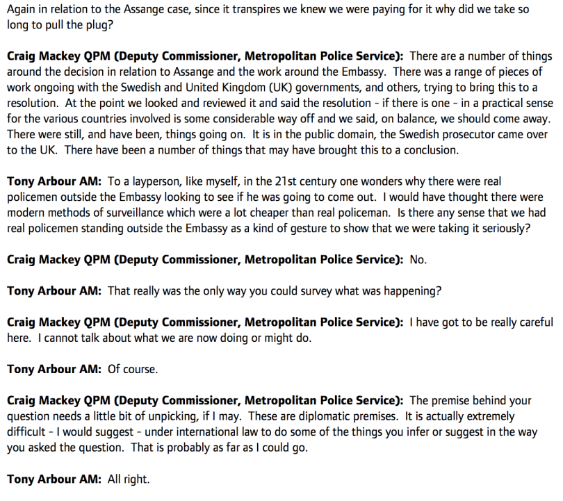 10 days after the removal of the uniformed police, during a London Assembly (a 25 member elected body tasked with scrutinised London Mayor’s spending) Q&A session with the Mayor’s Office for Policing and Crime, the cost of surveilling Julian Assange at the embassy is being discussed: (see below screenshots of the minutes) [1]